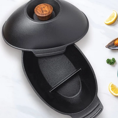 - BEAUTIFUL and MULTI-FUNCTIONAL DESIGN – Unique oval design accented with an Acacia wood knob and comfortable handles, perfect for cooking mussels or clams with your favorite broth; lid doubles as a vessel for collecting empty shells
