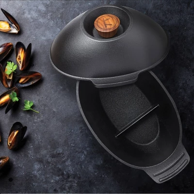 - CAST IRON SEAFOOD POT with LID – Make delicious seafoood creations with the Outset 2.5 quart capacity seafood and mussel pot, perfect for grill to table cooking and serving -safe for use on grill, stove top or oven!