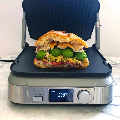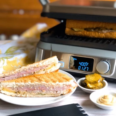 - Contact grill, panini press, full grill, full griddle and half grill/half griddle, sear function