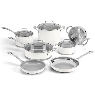 This premium cookware collection includes all of the essentials for classic cooking techniques like slow simmers, delicate browning and reduction of liquids and is also oven safe. An impact bonded aluminum encapsulated base for fast and even heating. Stainless steel cooking surface does not become discolored, react with foods, or alter flavors. Dishwasher safe so cleanup is conveniently hassle free. A beautiful white matte exterior to brighten up your kitchen and complement any kitchen décor.