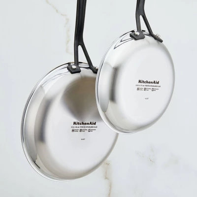 Build layers of flavor with KitchenAid 5-Ply Clad Stainless Steel Frying Pan designed for precision cooking with exceptional base-to-rim heat conduction. Crafted from 5-layers of heat conductive metal throughout, this heavy-gauge induction skillet is built to fuel endless possibilities in the kitchen while providing superior heat retention. Unique black stainless steel handles are dual-riveted and provide a sleek table top presentation. Sealed rims prevent corrosion, allowing for frying pan to be truly dishwasher safe. Broiler and oven safe to 500°F for versatility, freedom, and creative cooking.