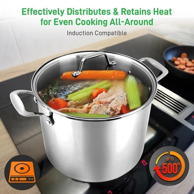Prepare your favorite soup, stew, or stock with the NutriChef 8-Quart Stainless Steel Stock Pot. This classic stockpot has a sleek, stainless steel design and a clear, tempered glass lid. Ergonomic steel handles make it easy to transport the stockpot from the cabinet to the stovetop – just make sure you have a towel or heat pad if the pot is warm. This heavy-duty commercial grade stockpot has strong, riveted handles and an impact-bonded base for even heat distribution. The stockpot is compatible with gas, induction, ceramic, glass, and halogen cooktops. The non-reactive interior is in a brushed finish, while the exterior is in a polished mirror finish. The large stockpot from NutriChef can handle temperatures up to 500 degrees Fahrenheit, or 260 degrees Celsius. Cook a variety of delicious foods with this commercial-grade 8-Quart Stainless Steel Stock Pot.