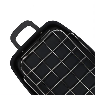 Lighter, easier and stronger—there’s a reason carbon steel is the choice of professional kitchens. Pre-seasoned to get you started, this OXO Obsidian Carbon Steel Roasting Pan develops a naturally non-stick layer with use. That makes it ideal for family-sized roasts, baking, lasagna, veggies, and more. The more you use this versatile roaster, the better the non-stick patina layer will be. Precision engineered for powerful performance anywhere you need it, this roaster travels effortlessly from stovetop to grill. This pan also comes with a roasting rack to keep roasts elevated and promote airflow. Oven safe up to 600˚F/315˚C. Hand wash only.