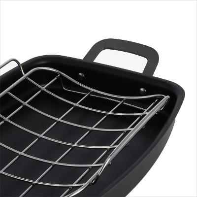 - V-shaped stainless steel roasting rack promotes airflow and keeps roasts elevated