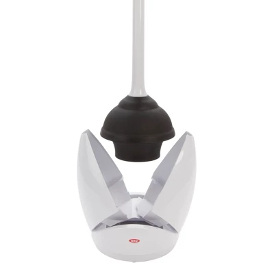 The OXO Toilet Plunger and Canister is designed to open when you lift the Plunger and close when you replace it for neat and hassle-free plunging. The flat-top handle provides a secure, comfortable grip while you work. The Plunger head works on all toilets, including low-flush models. The ventilated drip tray contains any excess water and allows it to evaporate. The tidy Canister keeps the Plunger out of sight when not in use.