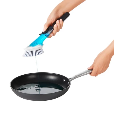 Add efficiency to your kitchen cleaning with this Soap-Dispensing Dish Brush Set from OXO. Featuring nylon bristles and a soft-grip handle, this plastic dish brush provides a sturdy cleaning utensil for scrubbing plates, frying pans and more. Pour soap into the middle of this dish brush by folding back a button just above the handle; press that same button to dispense soap as you wash, helping reduce cleaning time and effort. This dish brush set includes a plastic holder, keeping your brush clean and ready whenever you need to wash dishes.